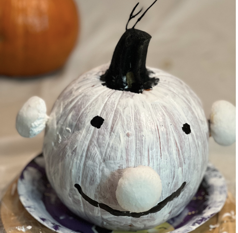 Turn your pumpkin into your favorite book character! Using white and black paint, paint a medium-sized pumpkin to look like “Diary of a Wimpy Kid,” and add pom-poms or cotton balls.