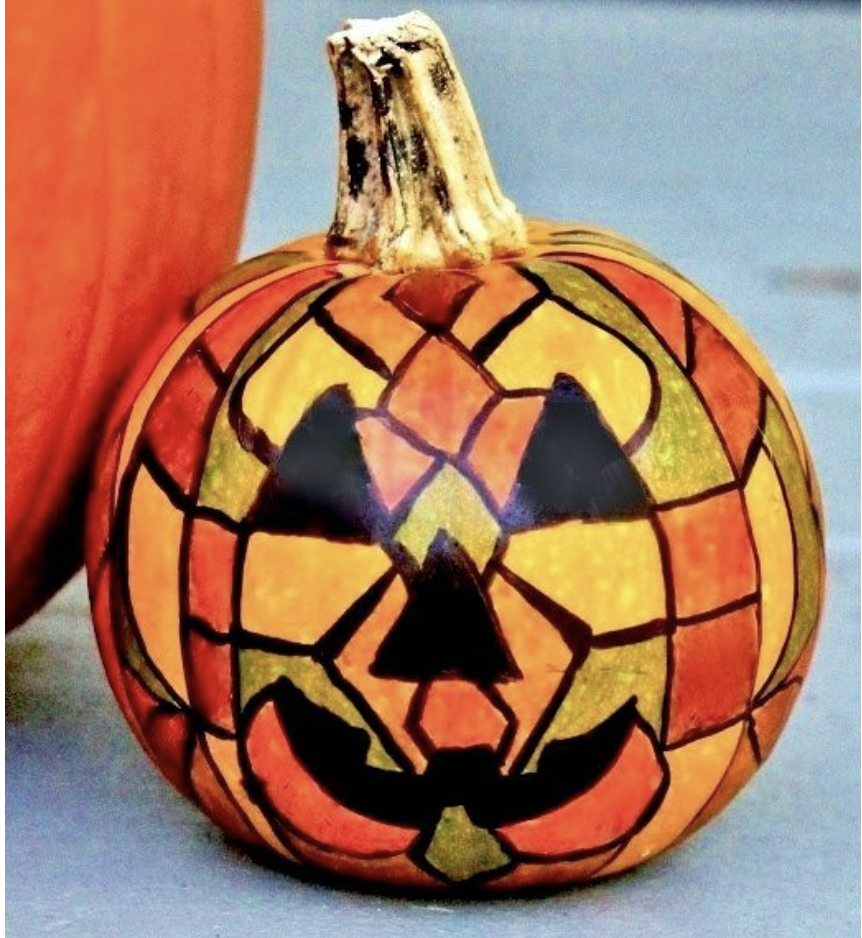 Use markers to create colorful shapes on a mini pumpkin for a stained glass effect. See the full tutorial at The Pinterested Parent.
