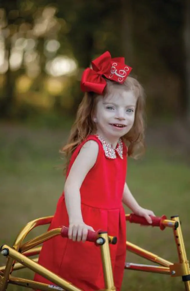 This issue’s cover-gal, dressed in red and looking very happy, is Emma Elizabeth Largent who is 5 1/2 years old. Emma has been diagnosed with a rare genetic disorder with no name (because no one else has it) as well as with tracheomalacia, laryngomalacia, congenital heart defect, chronic lung disease, chronic lung disease, chronic kidney disease stage 1, tethered spinal cord and chronic dislocated radial head. Although unable to speak, she loves to be outside (but hates the sun). She also loves glow sticks and balloons. Recently, she has walked 4 feet unassisted and has said “WOOO” like an owl.