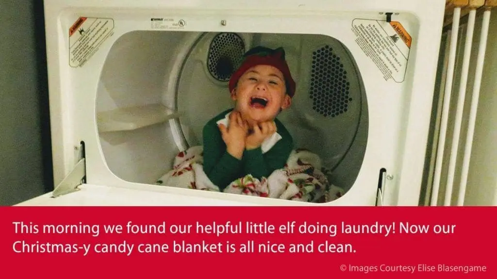 This morning we found our helpful little elf doing laundry! Now our Christmas-y candy cane blanket is all nice and clean.