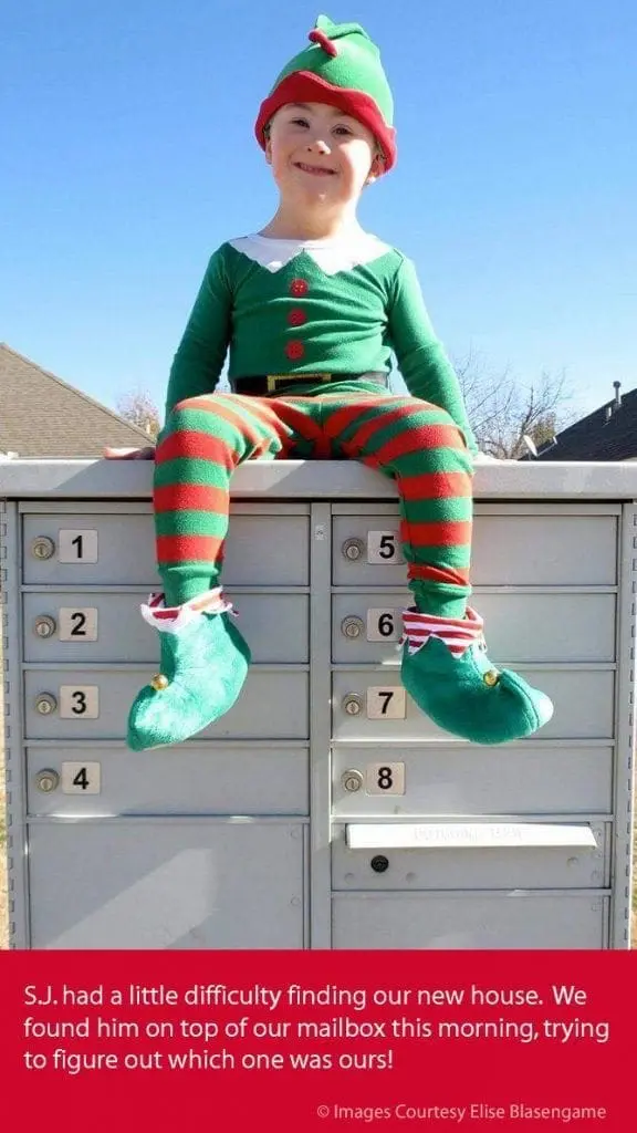 Three years ago, we decided to make our 11 month-old son, S.J., our “Elf on the Shelf” in the hopes of spreading Christmas cheer and raising awareness of Down syndrome inclusion. This is our fourth year that our mischievous little “elf” has been putting a smile on people’s faces, as well as showing everyone just how fun people with Down syndrome can be.