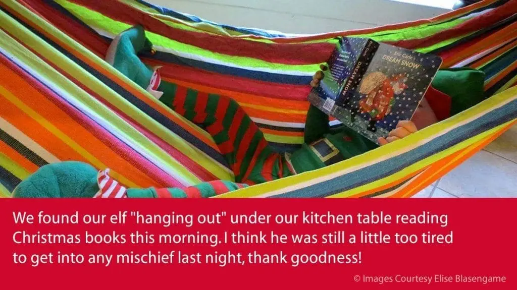 Caption: We found our elf “hanging out” under our kitchen table reading Christmas books this morning. I think he was still a little too tired to get into any mischief last night, thank goodness!