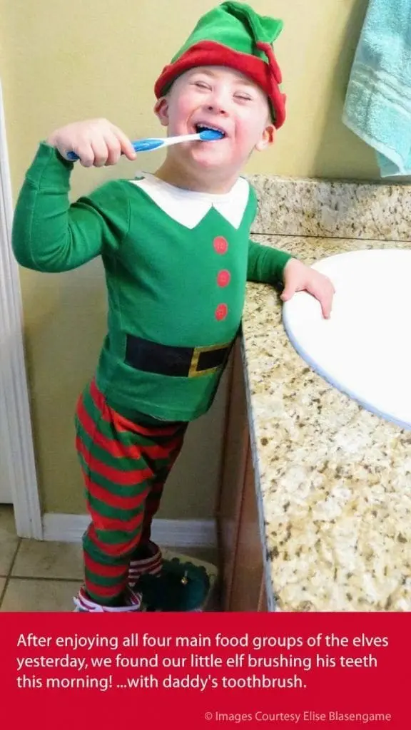 After enjoying all four main food groups of the elves yesterday, we found our little elf brushing his teeth this morning! …with daddy’s toothbrush.