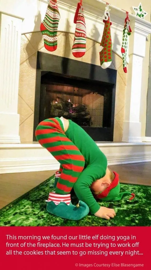 This morning we found our little elf doing yoga in front of the fireplace. He must be trying to work off all the cookies that seem to go missing every night…