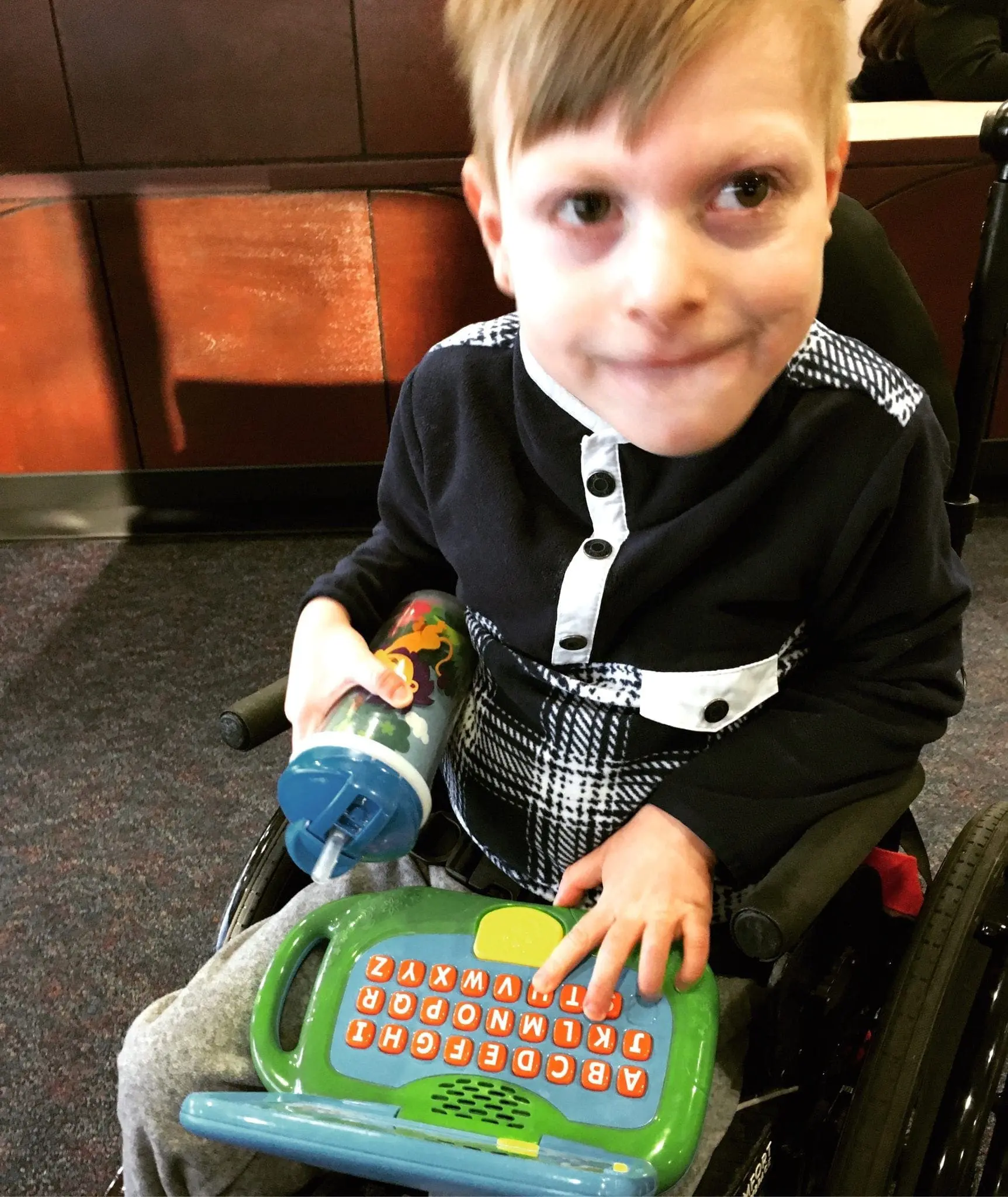 This one was an unexpected winner in our house. I had been practicing with my son on his speaking device in the same supported chair in our living room…until it occurred to me that both child and device were mobile. And routines lead to ruts. So, we took the Tobii on a walk, to the mall and to the grocery store. We began to “people watch” and recount (on low volume) what the world was up to. Because the surroundings were different each time, they provided different speech scenarios from what he could get at home or in therapy. I had finally found something unique to contribute to language learning. These became our “verbal adventures” where he became the narrator of his own story.