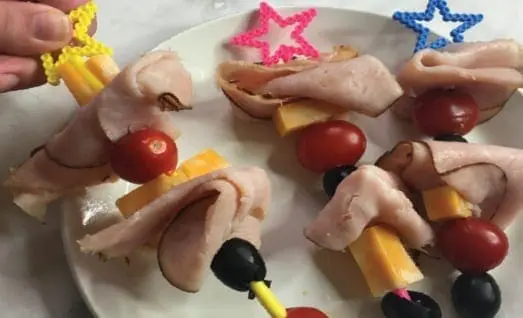 4. Sequencing and recalling information: This recipe has a specific order to follow; some of it can be prepared ahead of time so that it can be assembled in a uniform manner. Ask your child to tell you which ingredient they remember working with first, second, etc…. See how your child follows the steps. Ask them to tell you the order of the ingredients. Ask them if it matters what order the ingredients are placed on the skewer? What happens if they do not follow the order?