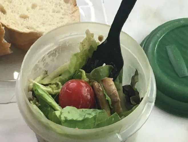 Add a little ranch dressing to the bottom of your container FIRST and THEN add the salad ingredients you like. We added some tomatoes, lettuce carrots, and sunflower seeds.
