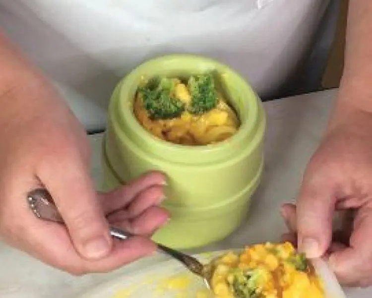 Use frozen macaroni and cheese of your choice. Add fresh broccoli (incorporating veggies) as much as you or your kiddo will eat before microwaving. Cook according to cook time on the macaroni and cheese package. Cover BEFORE putting it in the microwave to prevent any splatter. Scoop it all into a thermos and your mac & cheese will stay warm until you’re ready to eat it.