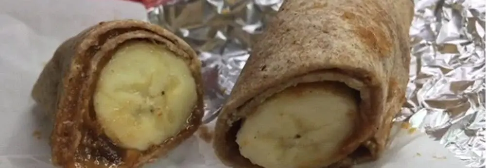 This one’s fast and easy. Grab a tortilla, spread peanut butter, then spread applebutter or applesauce. Then get a banana, peel it, break it in half and then roll up your tortilla. Cut the rolled up tortilla in half before putting it into tinfoil…and that’s a wrap!
