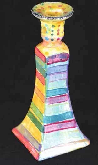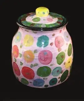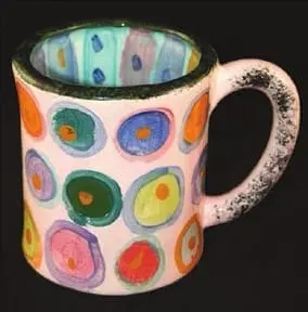 Angie is orderly and that order shows in her painting. Her work is of lines, circles, hearts and squares distributed in an orderly fashion across the canvas of ceramics. Of all the people at the Mustard Seed, Angie‘s work contains the most colors. Her palette is bright and clear; there is a cheerfulness that flows through all of her paintings.