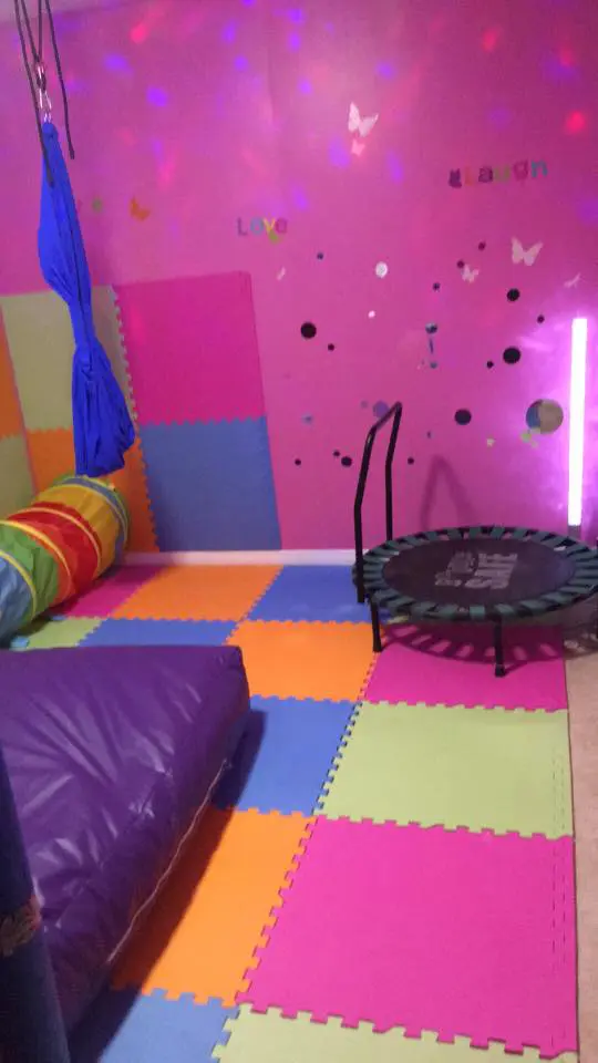 Her daughter now has a wonderful space to assist in the “calming down” process when she gets over-stimulated. The room is actually a very useful “tool” to use whenever the need arises to provide a space for her daughter to go. Trampolines and swings, for example, provide and promote vestibular stimulation (to assist in balance). An alternative, the less-expensive choice might also be a rocking chair or an exercise ball.