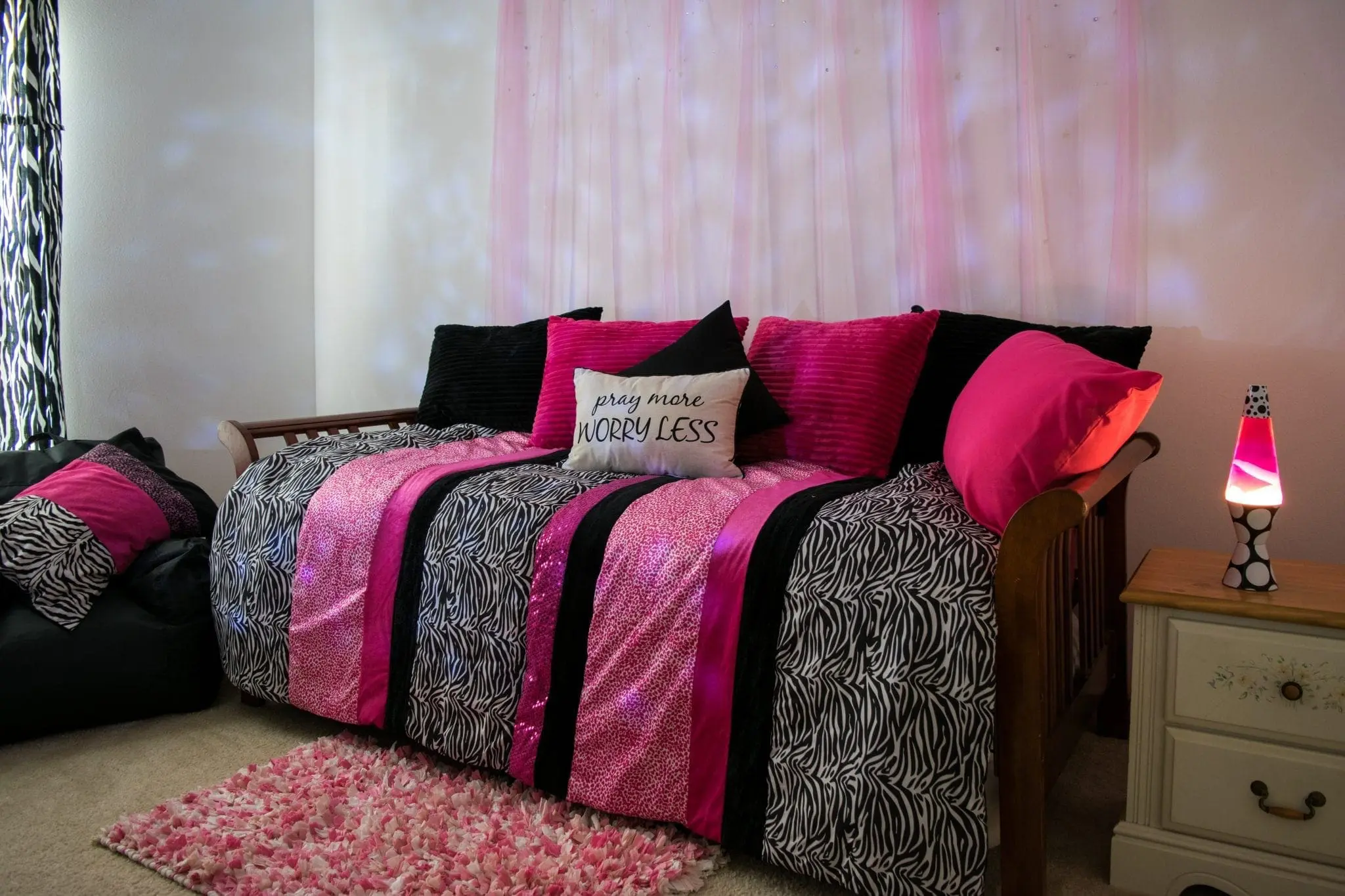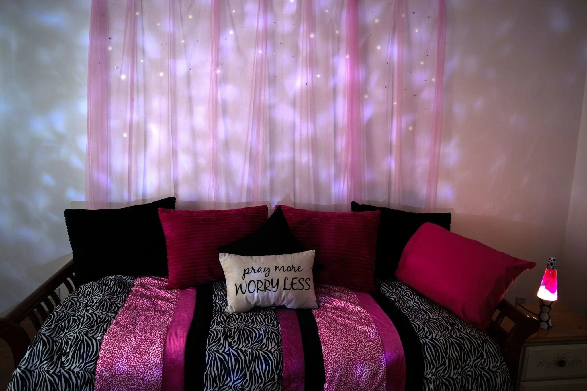 We wanted her to be able to see the glow in the dark stars, like she was looking up at the night sky as she was trying to go to sleep. During the day it just looks like a soft pink backdrop with glittery stick-on rhinestones placed randomly all over the top of the tulle. We decorated from about 2 feet from the top of the wall down. We purchased big, soft, furry pillows that match her comforter and, basically, turned her bed into a “big comfy couch”.
