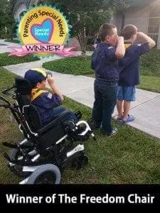 Our 8 year-old son has just joined Cub Scouts. There will be a lot of times that he, normally, will not be able to participate without being carried. The leader has offered to have the boys use their arms to make a “chair”. Now, he will be able to use this chair for many, many years to come.