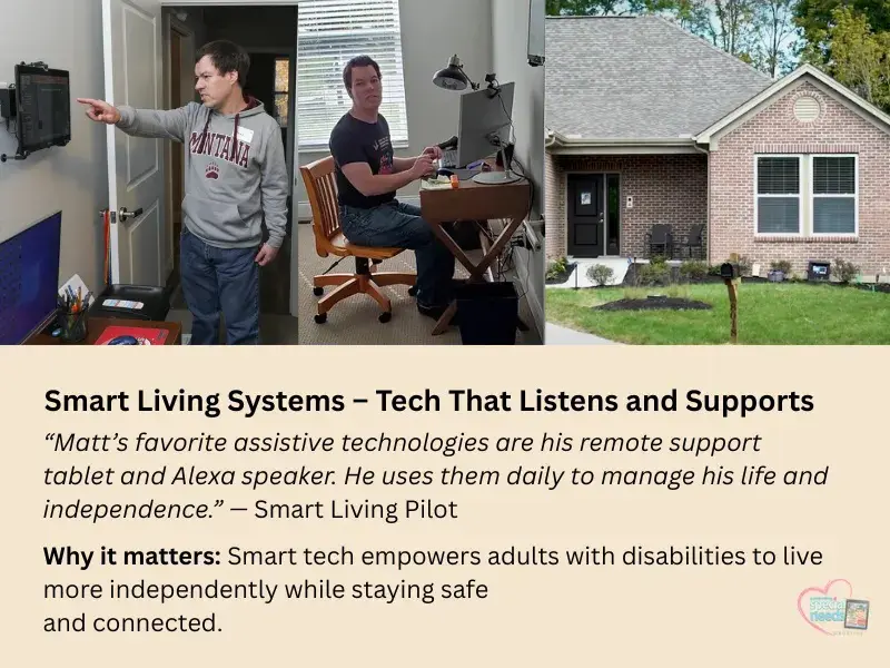 Working alongside a Xavier University occupational therapy graduate, Smart Living Systems developed a comprehensive assessment that evaluates an individual’s needs across all life domains. Based on this assessment and input from the person and their care team, they configure personalized technology plans that include remote and natural supports. Technology can be tailored to the individual or shared within a group home. Even in a shared space, each person can maintain their own custom solutions, reflecting both shared and individual needs.