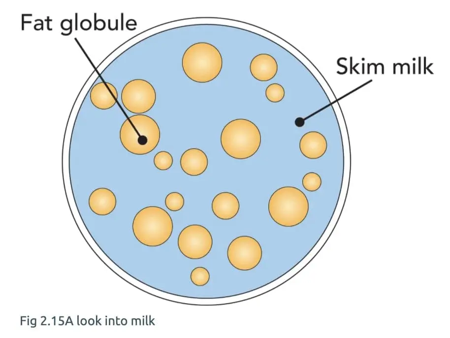 Well, if you can envision fat and water (or oil and water), the milk fat exists as small globules (liquid fat droplets) distributed or disbursed throughout the milk serum (the watery part of milk).