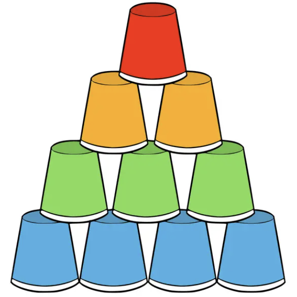 - When the time starts, the player will grab the cups and stack them in the following manner – 5 cups on the bottom, 4 cups in the next row, 3 cups, 2 cups, and one on top (15 total). Refer to the picture above.