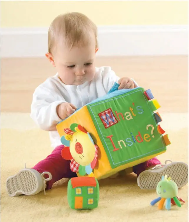 What’s Inside? Toy Box by OneStepAhead is a soft, colorful fabric toy cube with an “x” slit on one side. Inside the box are eight soft sculpted adorable objects to inspire imaginative play. Interaction is encouraged with the boat, house, octopus, sun, lion, rocket ship, dog, and monkey. The box serves as a wonderful way to reinforce the idea of in and out as well as providing as easy carrying case for mobile play opportunities