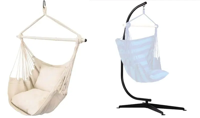 Bring the relaxation and organization that swinging brings to your living room. Attractive swing and sturdy swing base. Swing has a 500 lb limit.