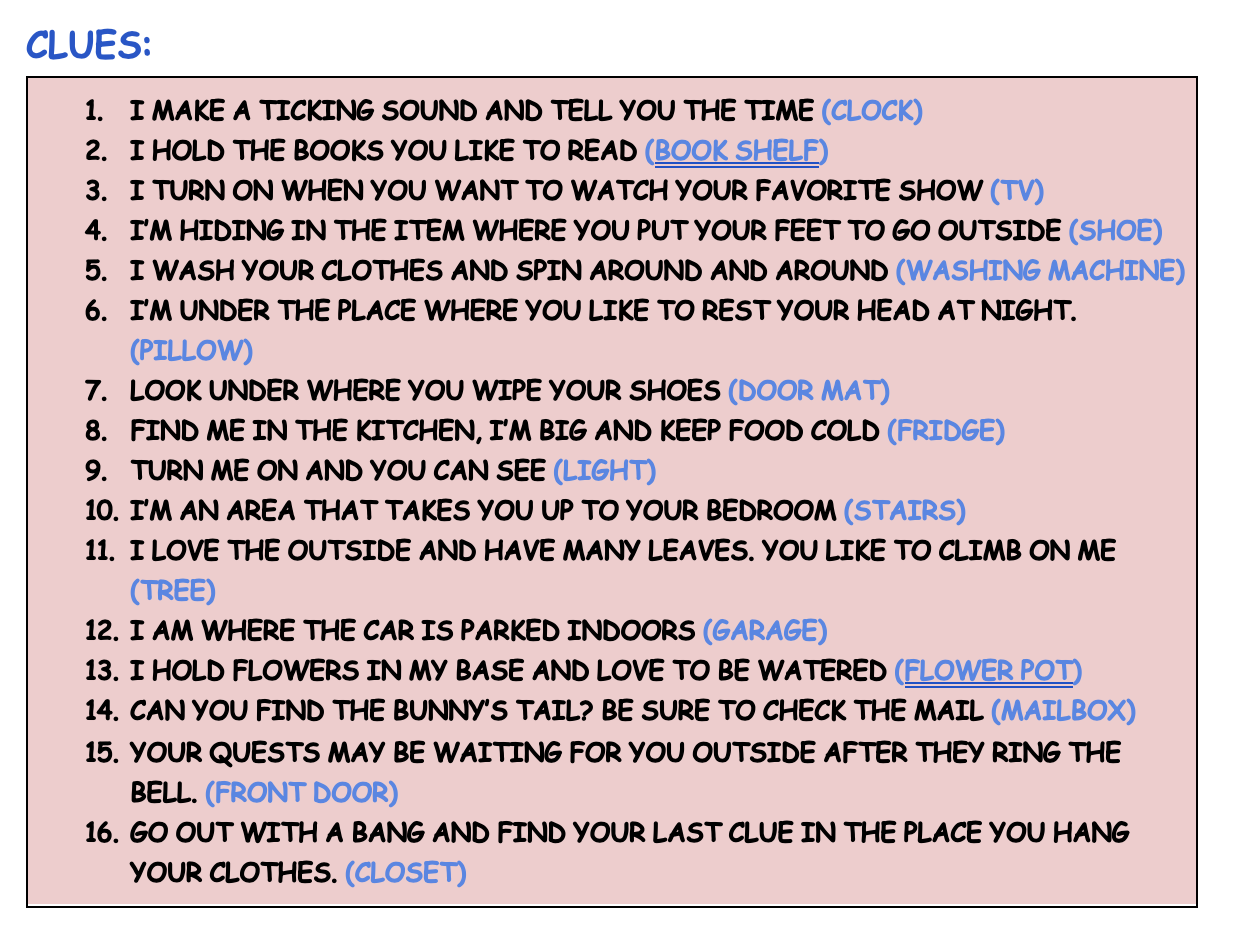 - Continue the game until they reach the grand prize (last clue) – YOUR GIFT OF CHOICE FOR YOUR CHILDREN.