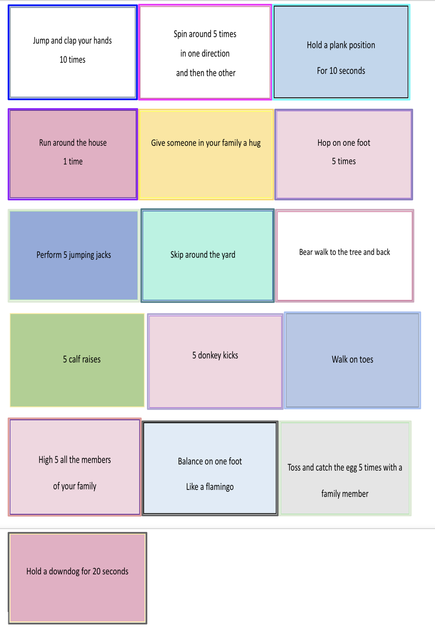 - Copy and cut out the exercise boxes below and Place one in each of the 16 eggs