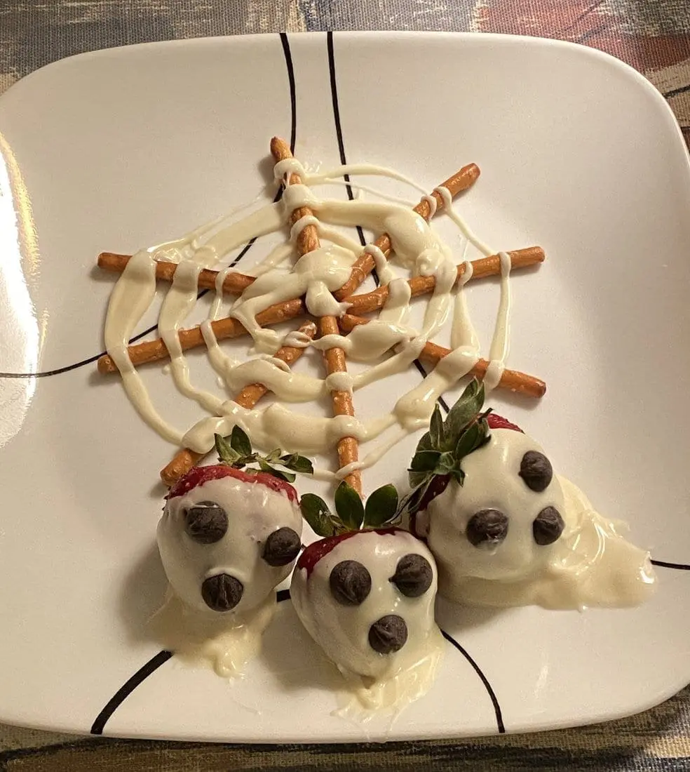 - Dip strawberries in white chocolate and add three chocolate chips for eyes and a mouth – instant edible Halloween ghosts!