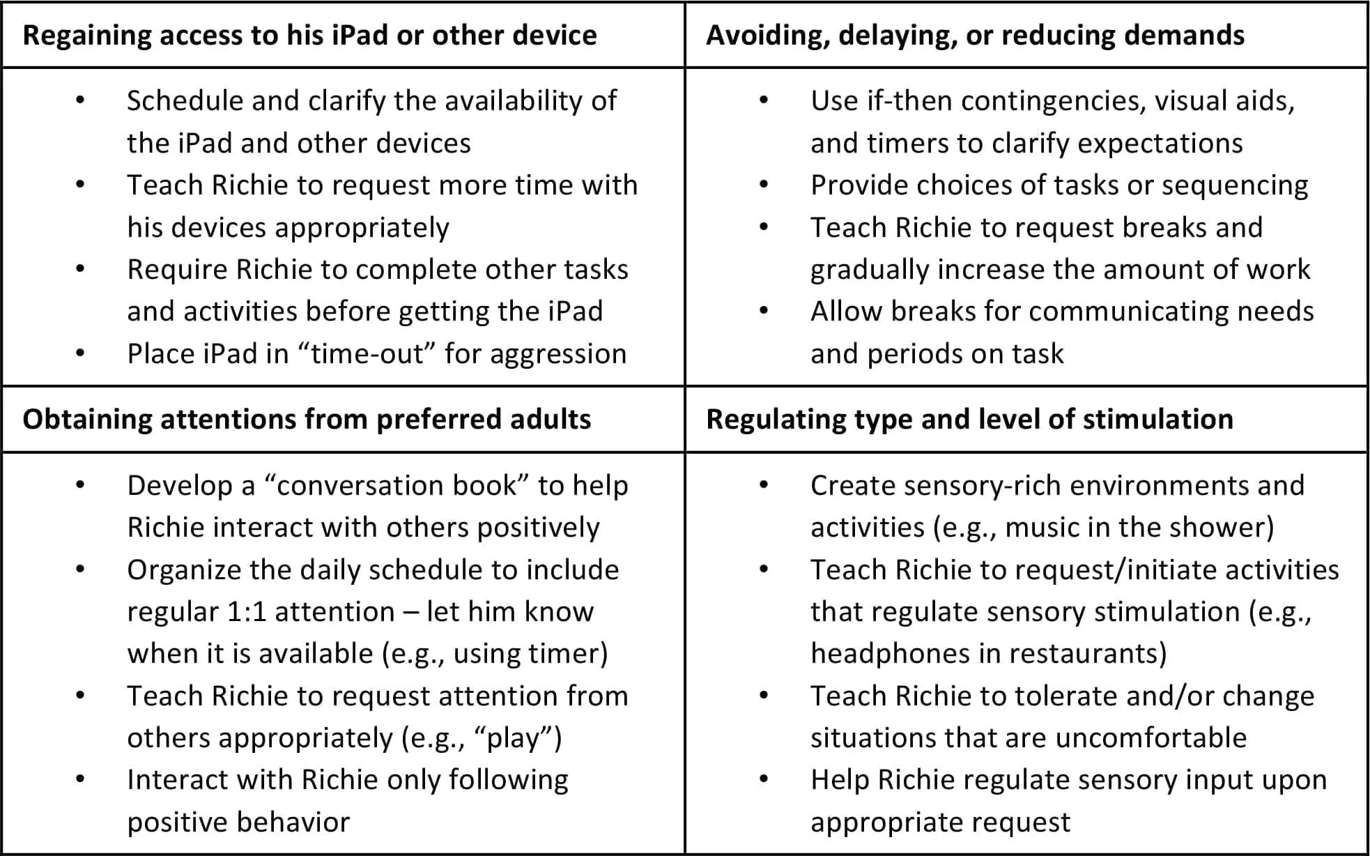 Richie is told to put away or denied access to his iPad – his behavior results in the iPad being returned, sometimes after a brief delay or redirection.