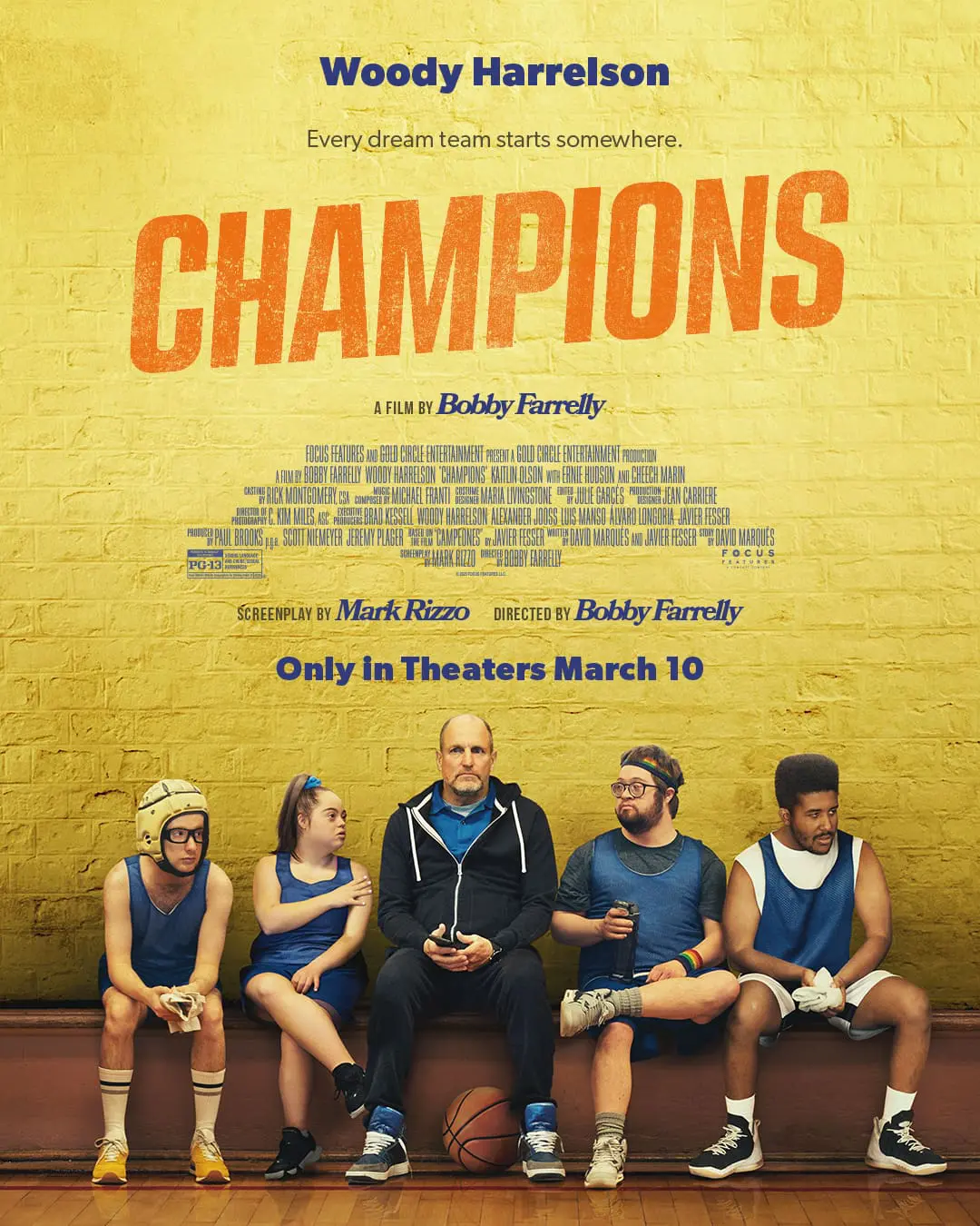 (L to R) Matt Cook as Sonny, Kaitlin Olson as Alex, Woody Harrelson as Marcus, and Cheech Marin as Julio in director Bobby Farrelly’s CHAMPIONS, a Focus Features release. Credit : Courtesy of Focus Features