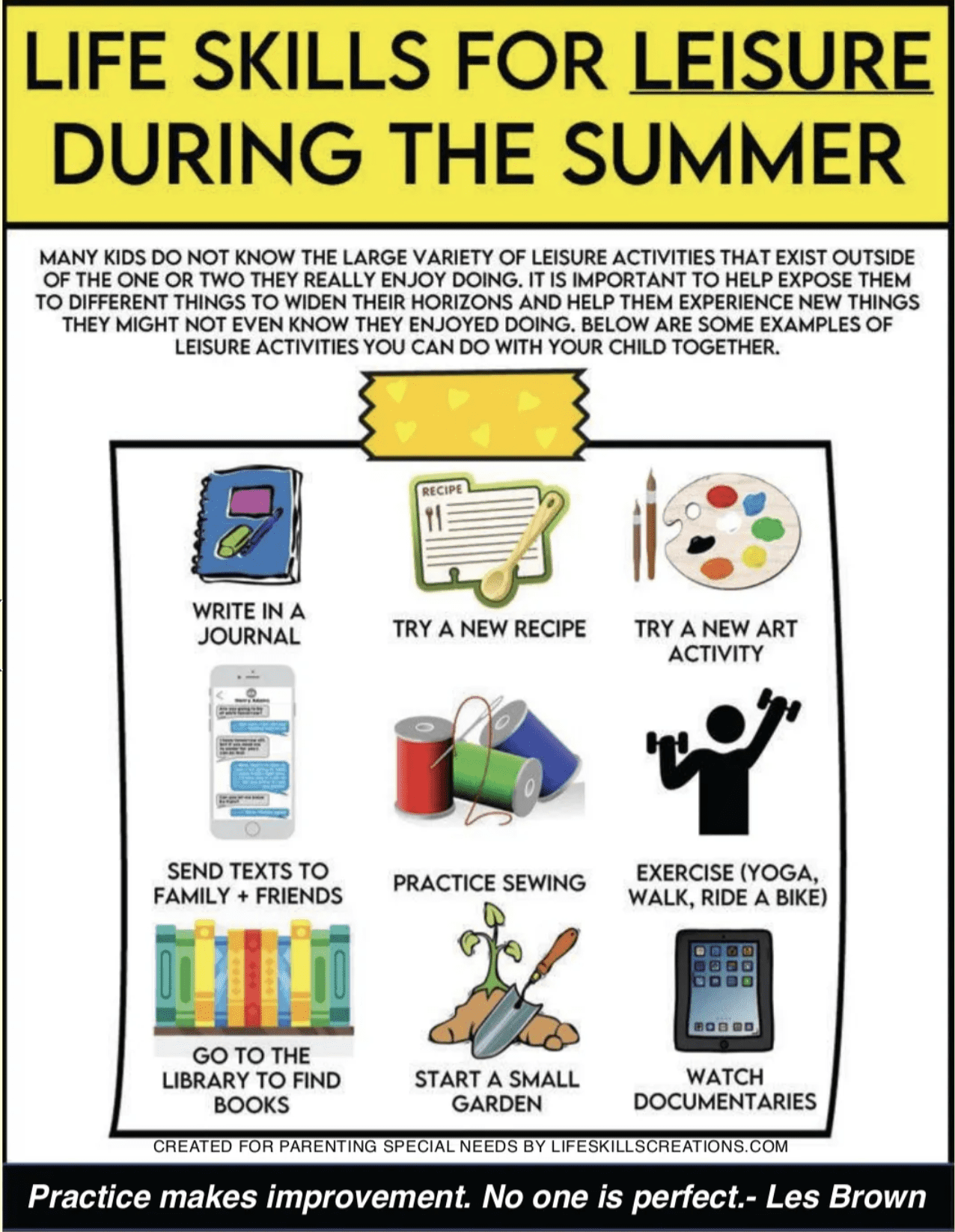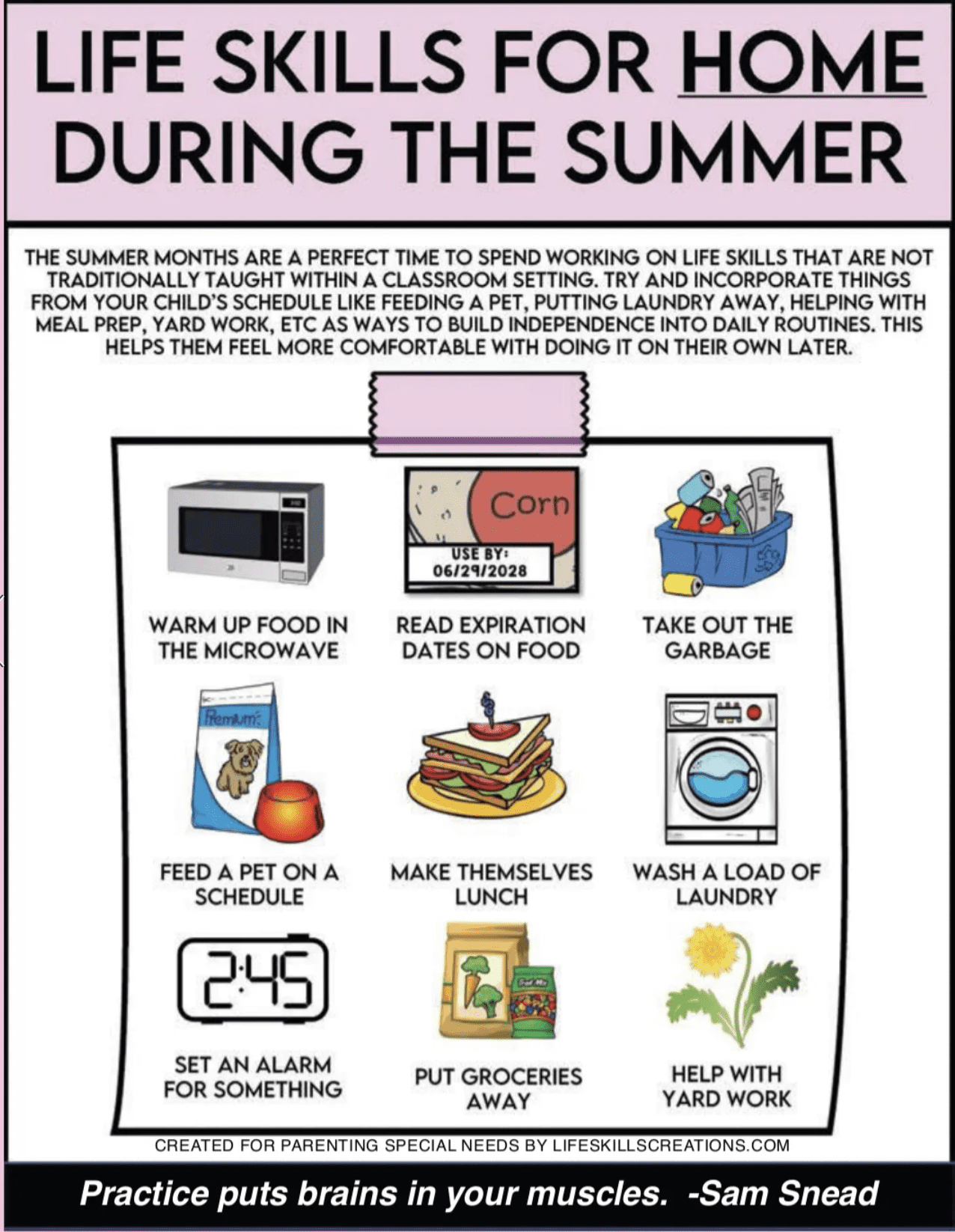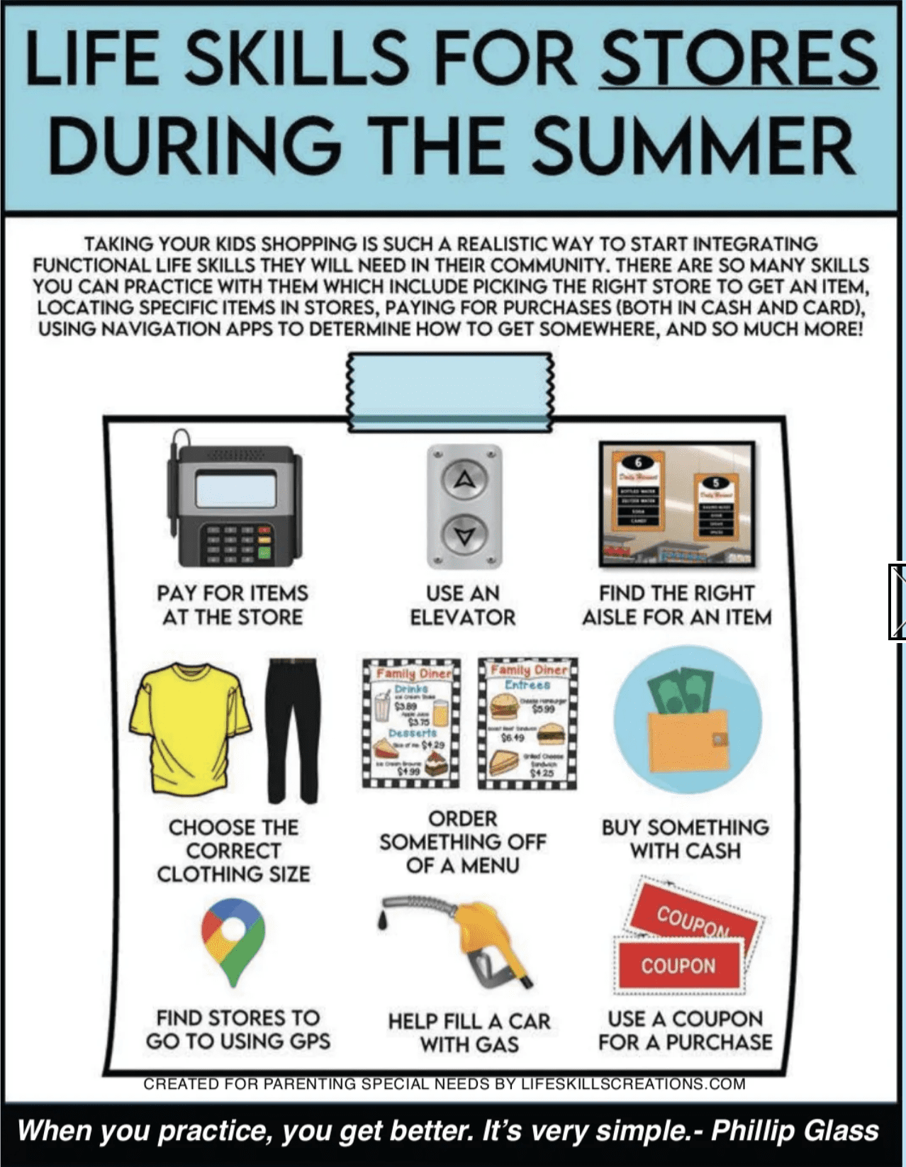 The next few graphics show some important life skills you can work on with your child this summer in the domains of home, stores, and leisure.