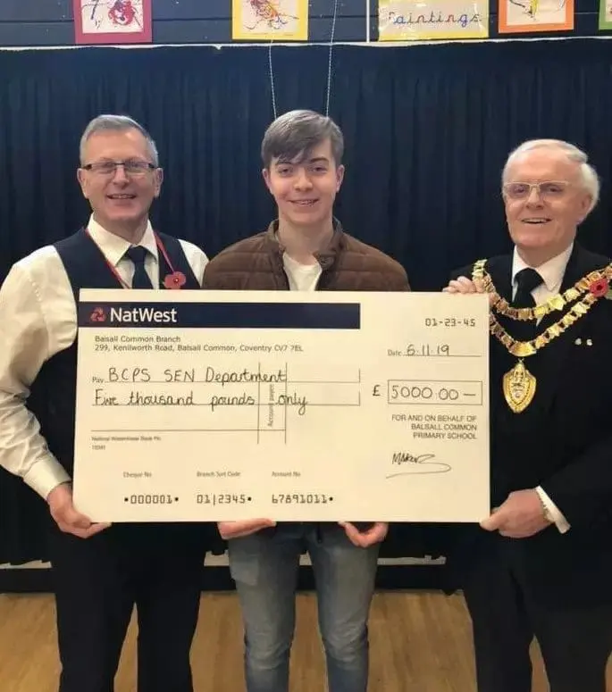 Presenting a cheque to Balsall Common Primary School SEN department with the Mayor of Solihull and the headteacher, Mr Burgess, November 2019