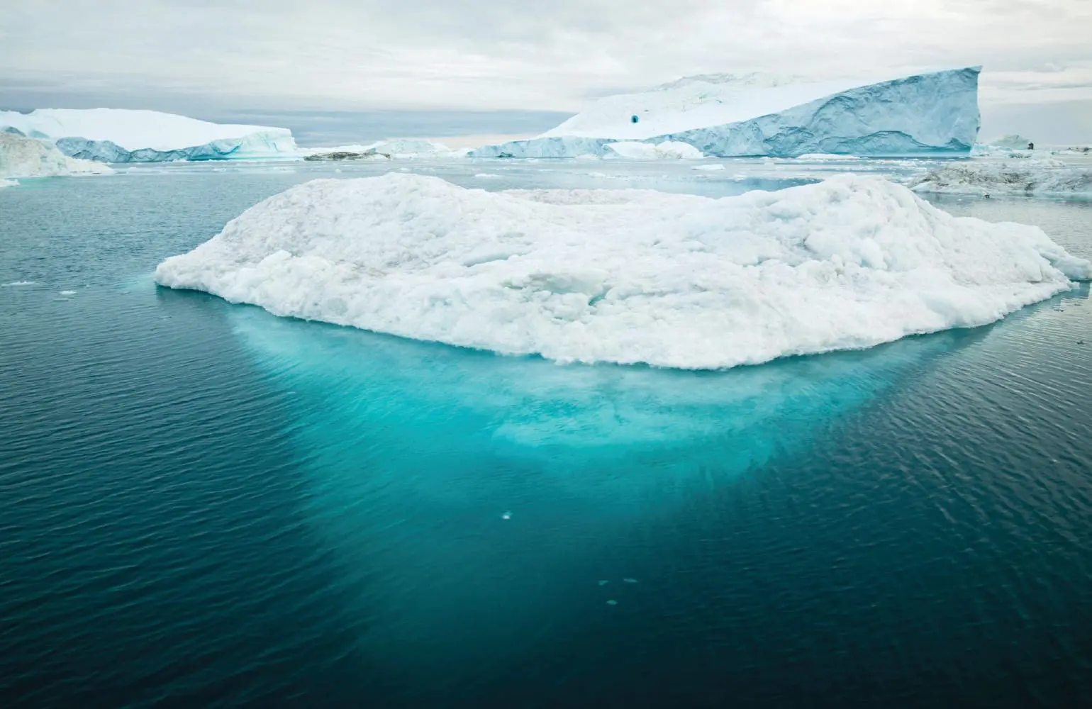 Arctic Icebergs in the clean arctic sea. On this image you can easily see that 1/10th of the iceberg is above the water surface and 9/10th is below the water surface. It is hard to believe that 90% of an iceberg is under water. West Greenland, 70 Degrees North.