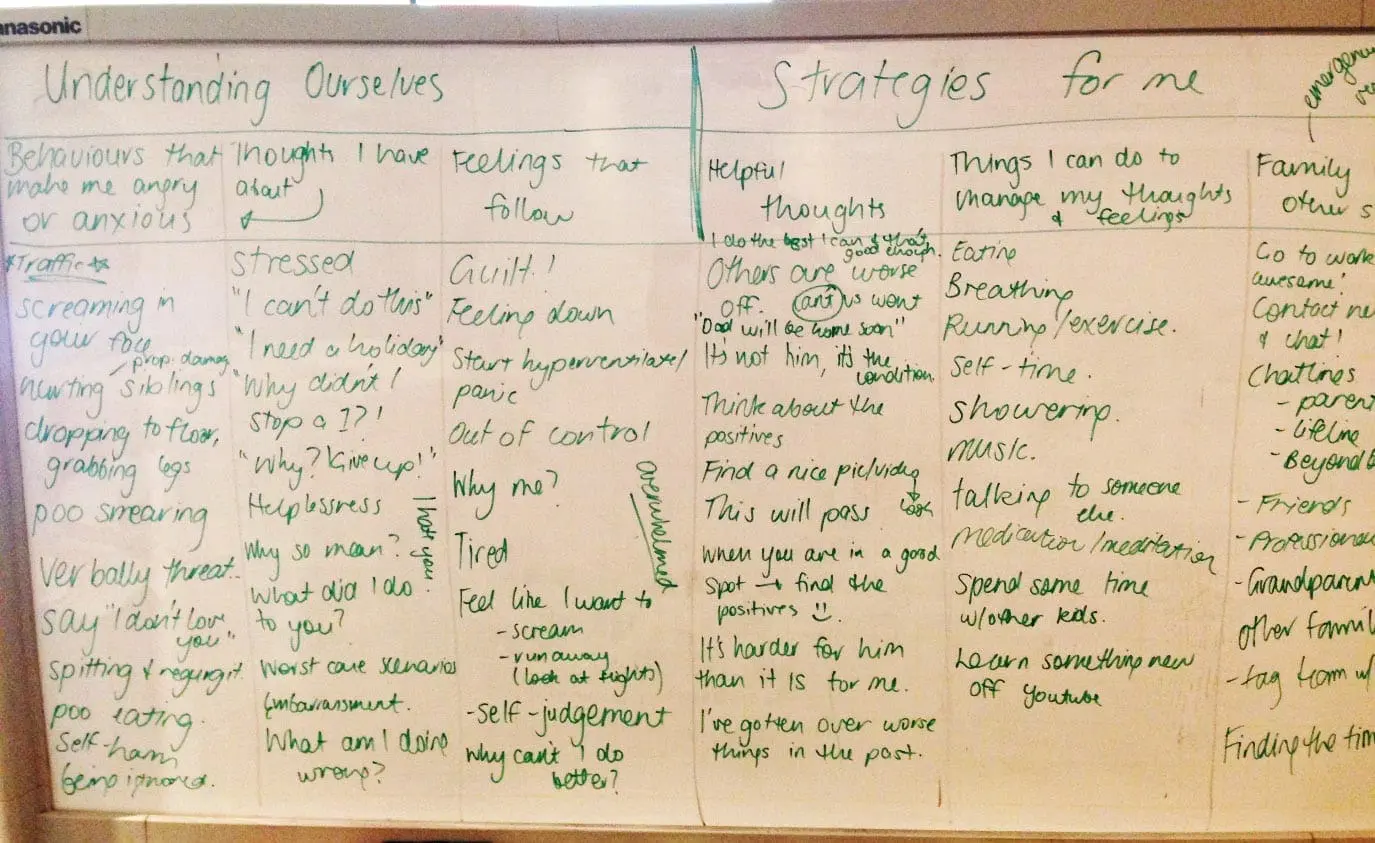 Below is picture of a white board from a brainstorming exercise of a similar process with a group of parents in Australia. Please note that no one strategy is right for every parent. You can generate great ideas and advice by sharing with others.