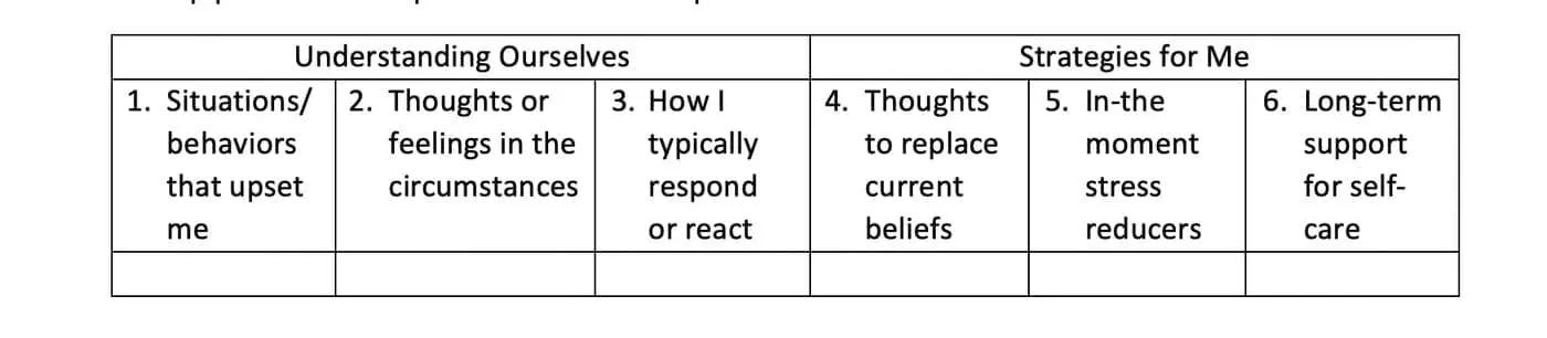 Mindfulness practices and other stress-reduction techniques can help release the physical and emotional tension, making it easier to reframe our thinking and regulate our reactions. Some of these strategies can include taking a few deep breaths, tensing and releasing our muscles, using visual imagery, employing grounding procedures (e.g., pushing soles of feet into the floor). Here is a free app for these types of practices: Practiced Mind