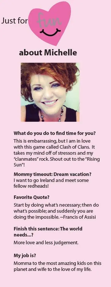 MR: Well, for starters, I just celebrated my 22nd anniversary with my wonderful husband, Mike. We have 4 great children: Brett, 20, who is in college; Nolan, 17, a senior in high school; Shelby, 13, is in eighth grade and Nikki, 10, is in 5th grade. Two of our children have special needs; Nolan battles bipolar disorder and Nikki was diagnosed with Asperger’s and ADHD. I will also add that her pediatrician said it is the worst case of ADHD she has ever seen in all her years of practice? I was hoping maybe that qualified me for some sort of a reward.