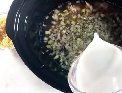 - After 3 hours of cooking in the slow cooker, add noodles and almond milk and cook for one hour longer.