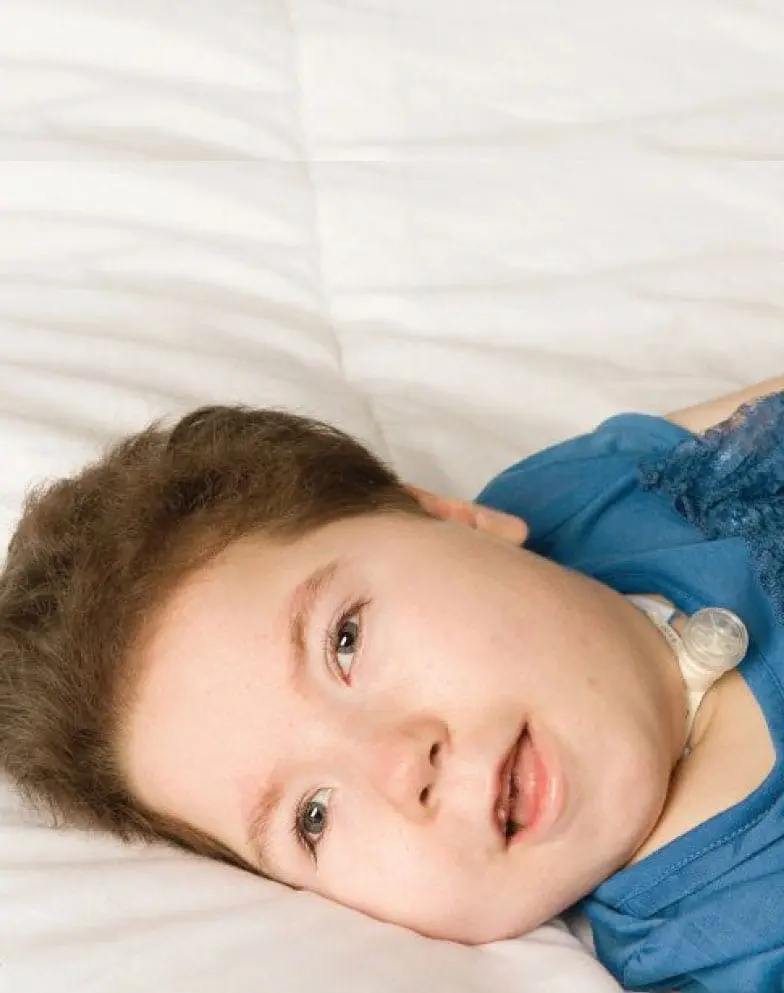 Unfortunately, Emily also faces some other challenges. She is visually impaired, unable to sit or walk due to low muscle tone, and is non-verbal, though she can make some sounds when she uses her speaking valve. She can communicate, to some extent, to those to know her by moving her tongue when she wants “more” of something or by faking sleep when there are new workers around trying to get her to do something. Emily is also tube-fed and has reflux, seizures, and global developmental delay. She is osteopenic (low bone mineral density), has scoliosis/kyphosis (a curved spine), and has a hip that dislocates several times a day.