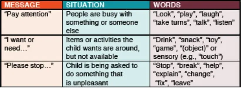 The table below shows different messages, the situations that are likely to prompt communication, and the different things children might be trying to express (i.e., “words” children might say if they could).
