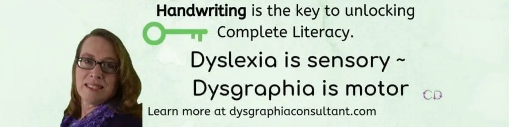 According to the Diagnostic and Statistical Manual of Mental Health Disorders, fifth edition (DSM-5), dysgraphia is a “difficulty with spelling (e.g., may add, omit, or substitute vowels or consonants) and written expression (e.g., makes multiple grammatical or punctuation errors within sentences; employs poor paragraph organization; written expression of ideas lacks clarity).” That definition is difficult to comprehend. My interpretation is that dysgraphia is difficulty writing by hand that does have another neurological origin or diagnosis. It can be co-morbidly linked to ADHD but is its own diagnosis.